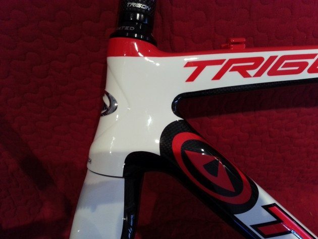 The photo below shows the frame with Trigon’s CWC38 clincher carbon wheels and some spare parts we chucked on it to determine sizing and set-up. This model is designed for cantis but there is a disc brake specific model designated the XQC02.