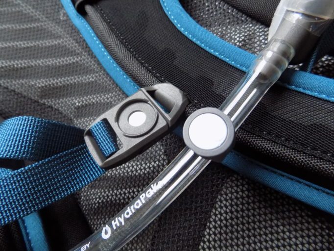 The hydration bladder is easy to fill because it has a wide opening with a slide-on closure; you drop the bladder into the bag and instead of then faffing trying to thread the tube through little holes you just pull the zip over the bladder and tube and you’re ready to go. Marvellous! And it’s easy to put a full bladder into an already loaded bag, so you don’t have to repack anything. The bladder holds 2.5 litres. I did find that the water/energy drink I put in the bladder and tube tasted plasticky. I’d sterilised the bladder and thought this was the taste, so I soaked some bicarbonate of soda and lemon juice in it for half an hour, and then washed it with washing-up liquid and this seemed to work.