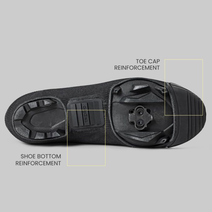 So what changes have been made to make the GripGrab Explorer a gravel shoe cover? Well all the elements that make them so good on the road have been kept and GripGrab have added armour. Armour in the form of TPU moulded toe-caps and wear patches on the sole. These injection moulded parts protect the woven material of the overshoe from the rough and tumble of off-road riding. Protecting the toe is a cap that covers top, bottom and side. So when walking off-road in mud and grit you won’t have to worry about wearing holes in your toes.
