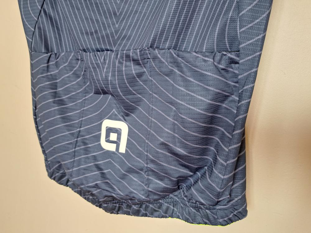 The jersey comes in three colourways – blue, turquoise or lavender – and it is quite an understated design for Alé, no tropical birds or colourful florals on this one! However, this is not a negative and instead it looks sleek and stylish. The subtle line detailing throughout the jersey with contrast band and panels at the top keep it interesting. It has three pockets across the back which are a decent depth to hold items such as your phone securely. The jersey claims to have a racing fit and I found this to be accurate. I am 178cm tall and 63kg so selected an XS jersey as per the sizing chart. This gave a perfect snug fit with a nice length to the sleeves.