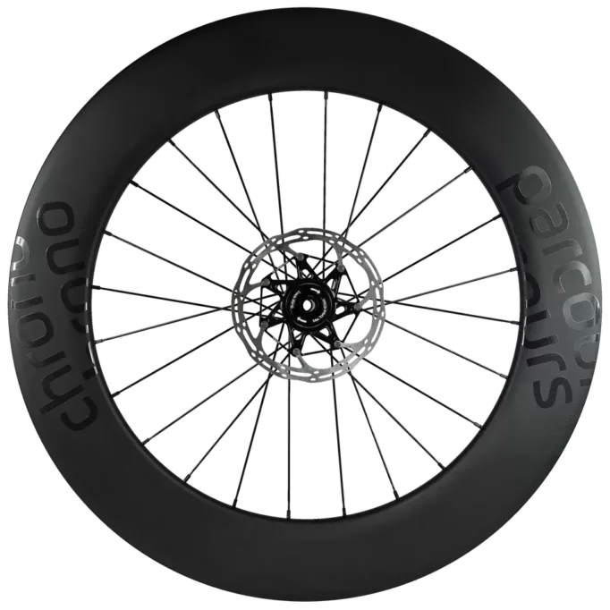 The full carbon Disc wheel has been designed time triallists and triathletes. Tubeless ready with a 17.5mm internal width and revised internal rim profile, the Disc can be run with a wider tyre at lower pressure. This will give you a more comfortable and faster ride. The rim has also has Parcours’ textured braking surface for improved stopping power. The Disc can be combined with either the Passista or Chrono front wheel depending on conditions.