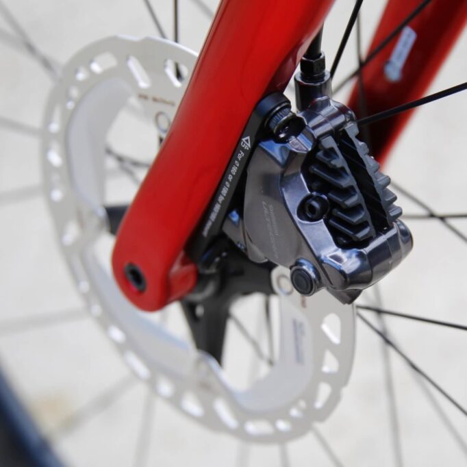 The new Ultegra Di2 levers have a lighter, smoother action than previous versions. This is something that has been taken from Shimano’s GRX Di2 levers. GRX levers use ServoWave technology to speed up initial pad travel. Once they’re on the rotor, power is applied in a smoother curve. General consensus is that the modulation and power is much better with the new Ultegra Di2. The pads are also set 10% further away from the rotors, reducing the chance of annoying rotor rub. And the rotors are the lighter and cheaper MT 900 and 800 from their Mtb range.