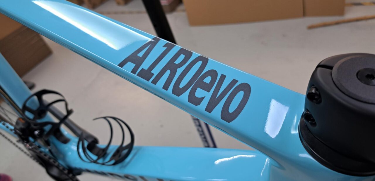 The A1R0evo (aero-evo) is Handsling’s own design, made from T800 Toray carbon. The frame is UCI approved, so Francesca can safely race it knowing that it has passed their safety standards. When I first saw the frame, the first thing that I liked was the colour. Call me shallow, but a bike has to look good. Handsling have recently installed their own spray-booth, allowing them to offer their customers thirty different colours. Thirty!