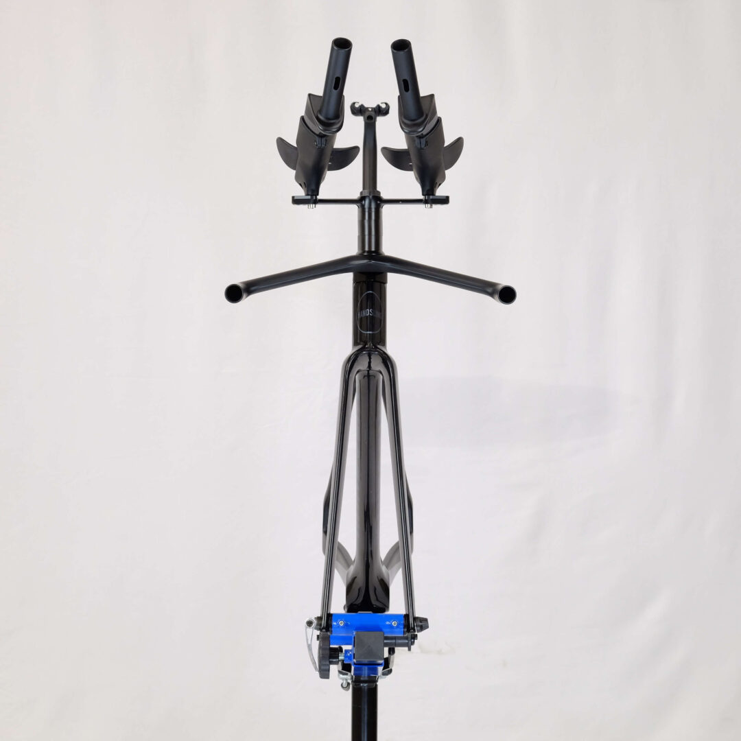 Handsling state that the frame is “optimised for aerodynamic performance and exceptional power transfer, with a bespoke carbon cockpit“. That bespoke cockpit is fully adjustable and is another item unique to Handsling. The carbon base-bar and extensions can be adjusted to get you into a PR-busting position. It’s not just about aerodynamics on the track though.