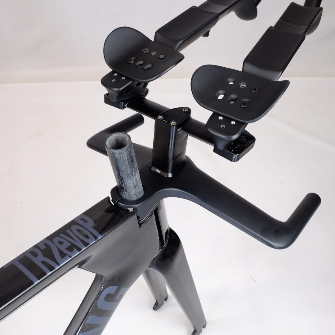 The TR2evoS frame is designed to provide a precise and stable platform on which to launch that race-winning sprint. Up front a beefy, bespoke, one-piece, shallow drop, carbon sprint handlebar looks both purposeful and futuristic. This has been engineered to handle the massive twisting forces that sprinters put through the bars.
