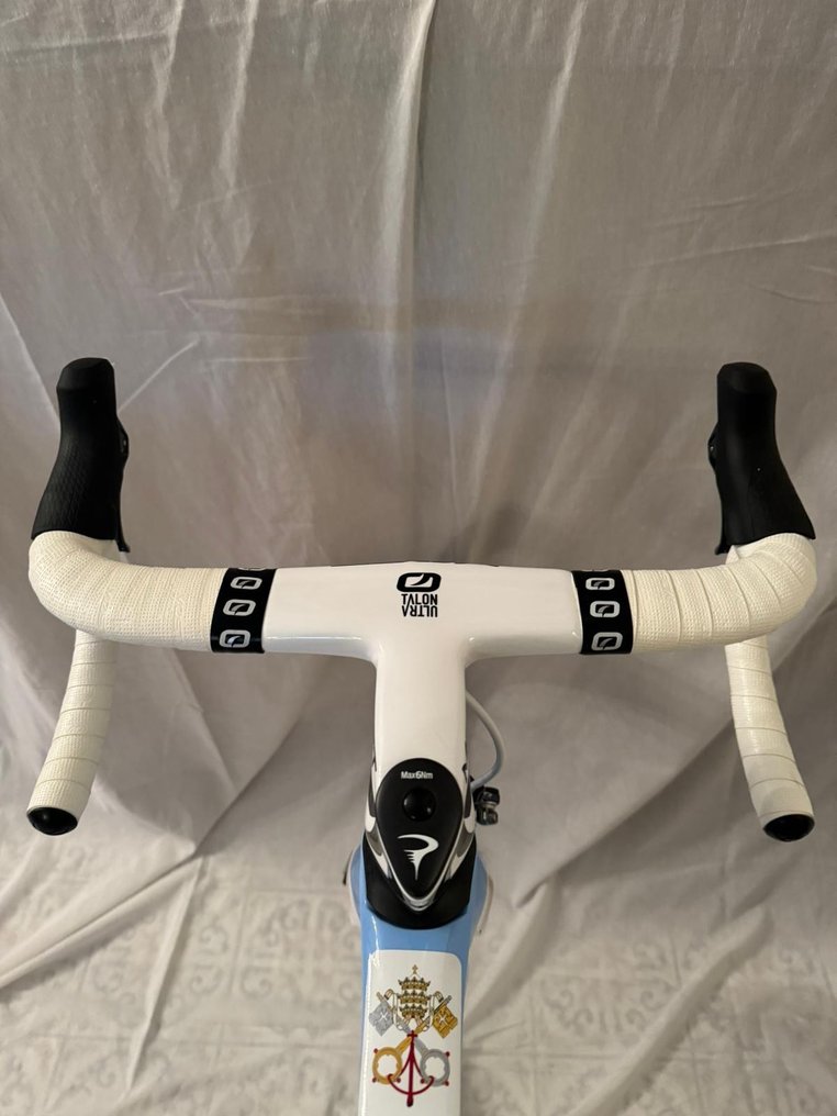 The Pope’s Pinarello is a 53cm frame with rim brakes, yes the Pope eschews modern cycling dogma! The rest of the spec includes a complete Shimano Ultegra 11-speed groupset, one piece carbon Most Ultra Talon cockpit and Vision carbon wheels